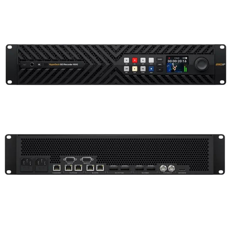 Der HyperDeck ISO Recorder 100G wurde speziell für die Liveproduktion konzipiert, kann bis zu acht Kameras gleichzeitig aufzeichnen und unterstützt Aufnahmen bis zu UHDp60 in ProRes. Zudem stehen redundante 100G-Ethernet-Ports zur Verfügung, sodass alle 8 Videokanäle über nur eine Ethernet-Verbindung übertragen werden können.